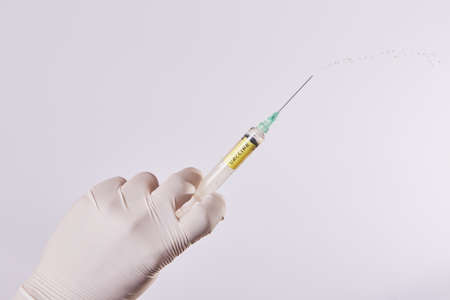 a hand in a black glove holds a syringe on a needle drops of vaccine medicines from virus