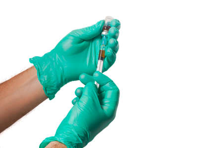 Nurse in gloves fills a syringe with a healing solution from an ampoule on a white background