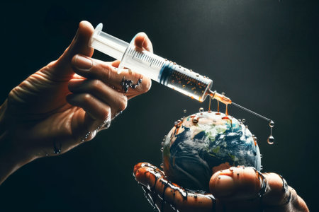 Another perspective on the close-up shot of a small Earth, emphasizing the action of extracting oil with a syringe to further highlight the theme of resource depletion and environmental impact