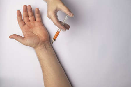 The doctor in medical gloves makes an injection intravenously to the patient during treatment to prevent the disease.