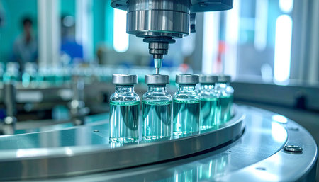 High-tech pharmaceutical robotics line showing fluid filling, sealing, and labeling stages