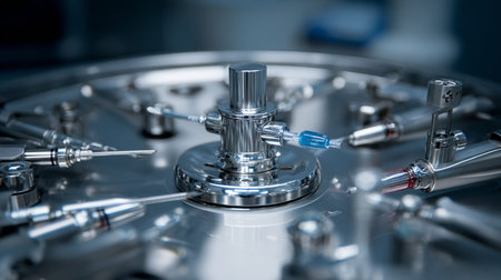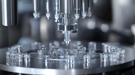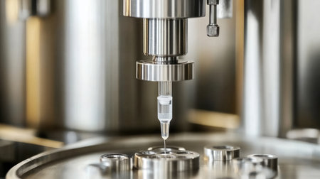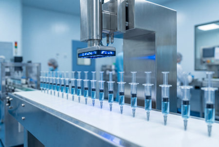 A robotic syringe filling machine preparing vaccine doses.