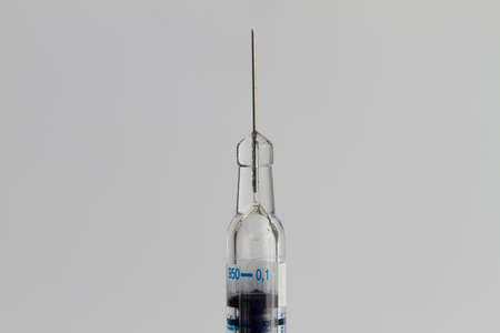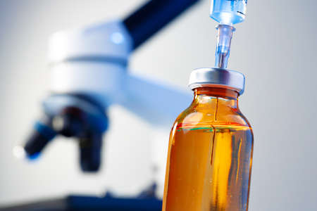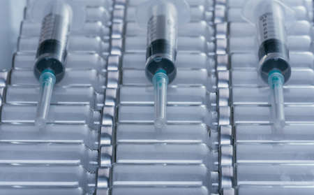 Medicine, Injection, vaccine and disposable syringe, drug concept. Sterile vial medical syringe needle. Glass medical ampoule vial for injection.