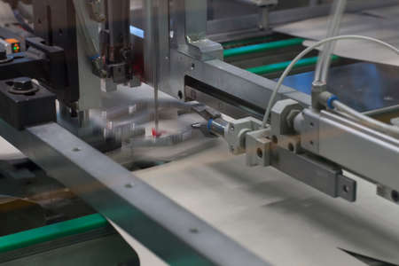 Close up detail of cartographic industrial machinery at work in a production line, conveyor belts are visible, no people are present.