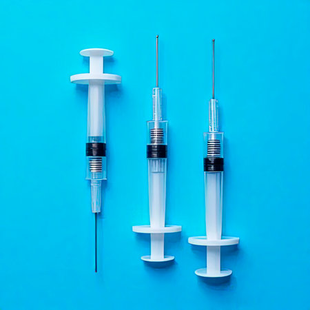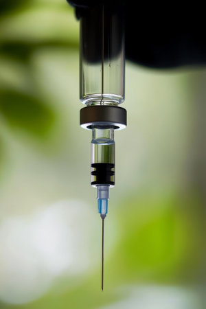 A syringe is positioned above a glass vial, ready for dosage preparation. The clinical environment suggests a focus on health and medical procedures, with equipment nearby.