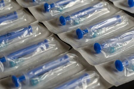Group of new medical syringes. Blue Medical syringes in a package. Medical syringes in packaging as an abstract background. Selective focus. Close-up.