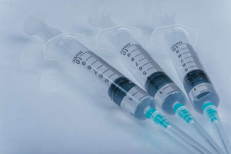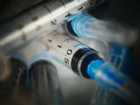 Several syringe on white table prepared for injection in hospital, selective focus, DOF, macro