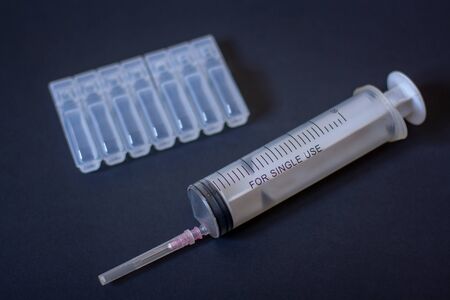 A large disposable syringe and a package of plastic ampoules lie on a dark background. Transparent liquid in plastic ampoules. Focus on the syringe. Vignetting. Horizontal.