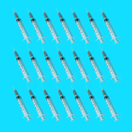Syringes on a cyan background. Flat lay seamless pattern, minimal pandemic concept