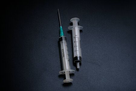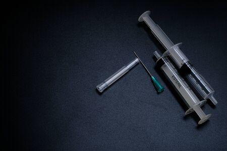 Medical Syringes with Needle on Black Background, Close up Syringe, Health care concept.
