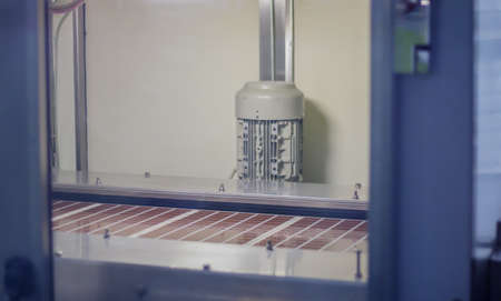 Line for the production of chocolate in an industrial factory. Automatic process in the production line of sweets. Images from the chocolate factory during production. Conveyor belt with sweets
