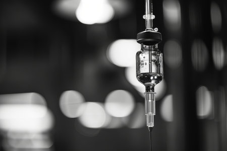 A medical syringe hangs suspended, filled with a clear liquid, with soft lights creating a blurred effect in the background, evoking a clinical atmosphere.