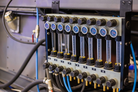 Flowmeter, rotameter - water flow regulator for cooling system of injection moulding machine at plant, factory - close up. Measuring and control equipment concept
