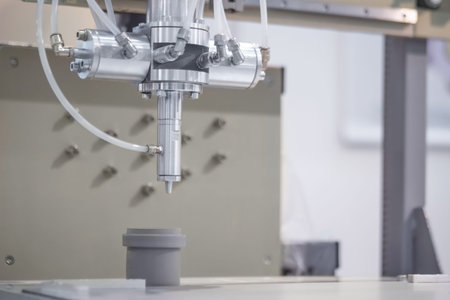 Robotic machine injecting liquid into petri dishes in pharmaceutical laboratory