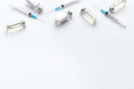 Flat Lay on medicine and healthcare. Treatment of patients and vaccination from virus. Syringes, dropper, ampoules.