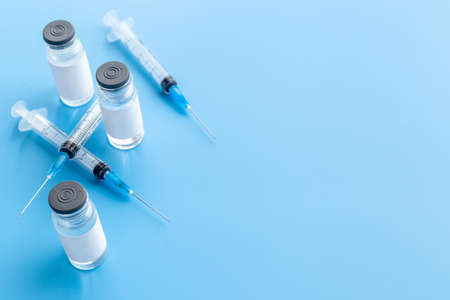 Ampoules of vaccine and a syringe on a blue background. Vaccination Coronavirus. concept of the medicine and the immune system. Vaccination against viral infections. Flatly. Copy space