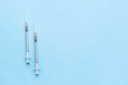 Top view of medical syringes with needles on blue background with copy space. Injection treatment concept.