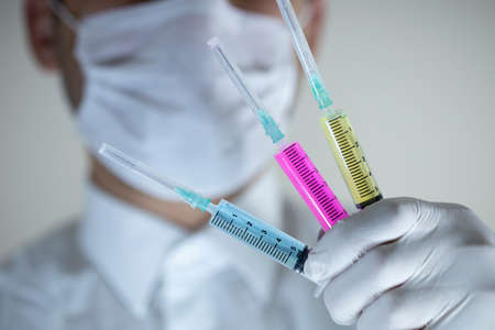 Medical vaccine against coronavirus close-up, covid 19, vaccination, injections, syringes, medical masks