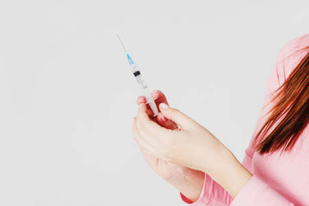 Disposable syringe in female hand on gray background isolated