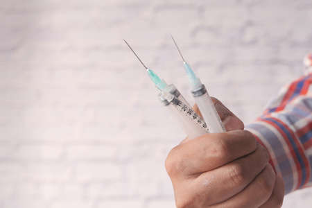 hand holding many syringe with copy space