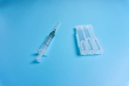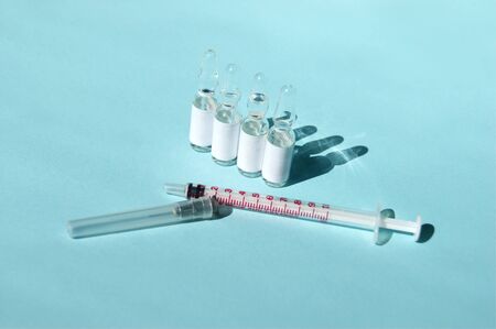 Drugs or vaccines in ampoules and an injection syringe on a light blue background. The concept of medicine, timely vaccination and health.