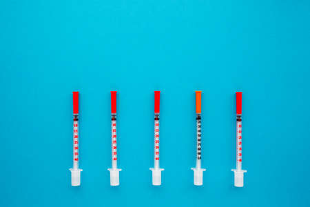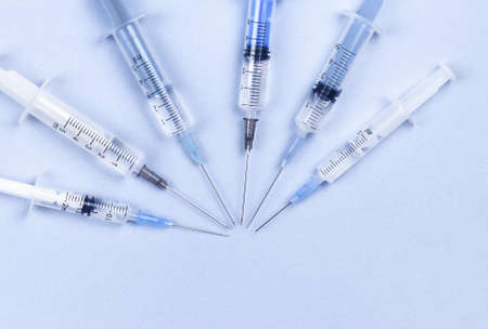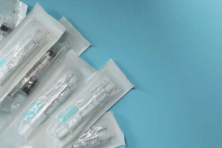 disposable syringes on blue background
