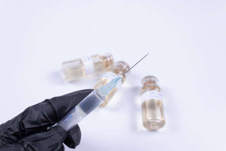 A doctor in a medical glove holds a syringe with a vaccine and vial with a vaccine. Healthcare concept