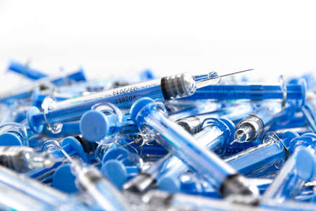 Medical syringes for injections lying isolated over light background. Injection medicine concept. Selective focus. Horizontal shot