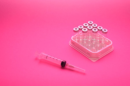 Vaccination and Immunization. Vaccine vials and clean syringes. Top view. Copy space. Web banner