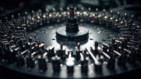A close-up view capturing the intricate details of an industrial machinery component featuring a rotating center piece and numerous metal pins.