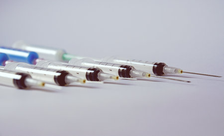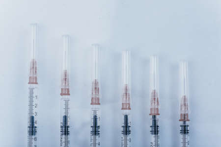 Several syringe on white table prepared for injection in hospital, selective focus, DOF, macro