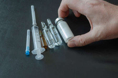 A hand, syringe, three vials, and bottle of white powder. The hand is holding a bottle of medicine. Close-up, selective focus.