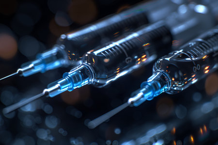 Syringe, drugs and medicine for vaccination, healthcare and wellness for longevity. Abstract, needle