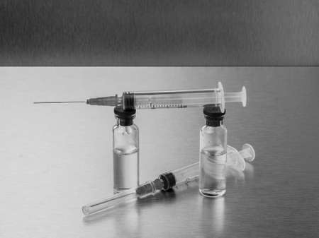 Syringes and ampoules on a polished metal background. Vaccination and immunization concept. Selective focus. Black and white monochrome image. Copy space.