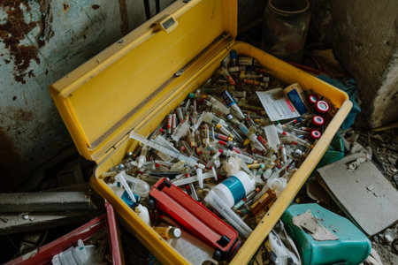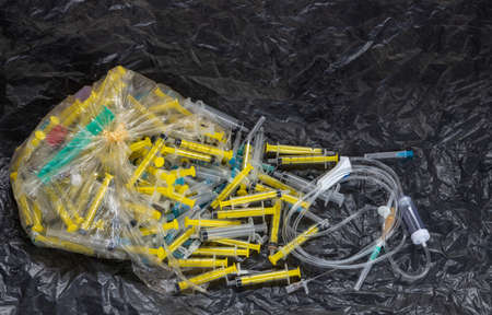 disposal of medical waste used disposable syringes lie in a large pile, Black background