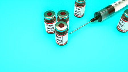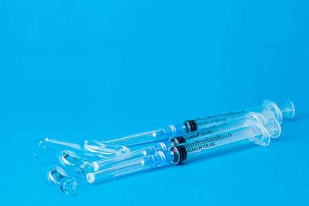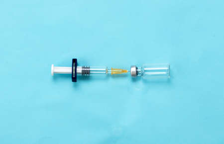 Coronavirus vaccine vials. Covid-19 vaccination with vaccine ampoules and syringes. Vaccine against the pandemic. Blue background. Stop Covid concept. Clinical trial.