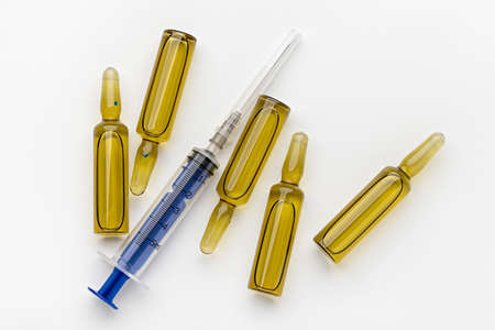 Glass ampoules with yellow medicine and syringes lie on the table