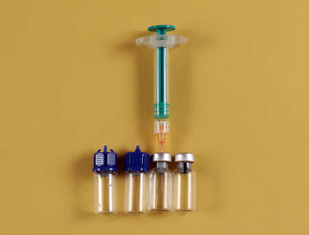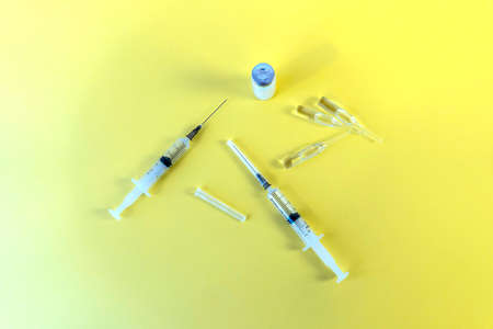 Medical syringe and glass vials in coronavirus vaccine medication on yellow background