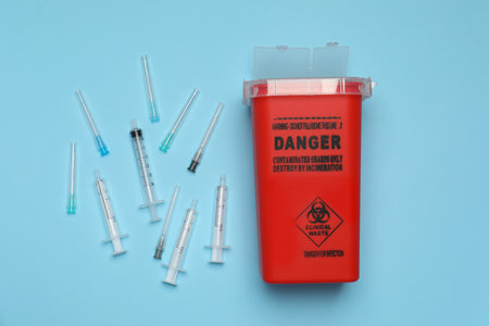 Disposable syringes, needles and sharps container on light blue background, flat lay