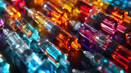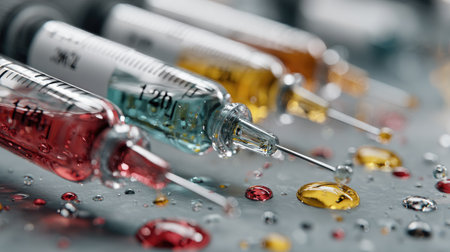 This image showcases an array of colorful syringes filled with various liquids on a surface, emphasizing the precision and detail in a clinical setting.