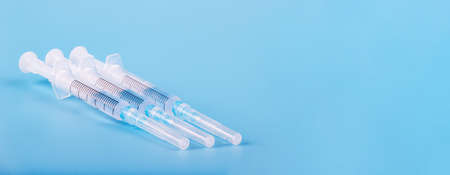 Close up of plastic syringes on blue background with copy space