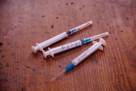 Used by drug addict syringe needle on dirty wooden table.