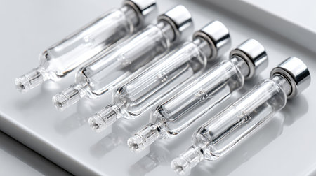 This image features clear glass vials with silver caps meticulously arranged on a white tray, ideal for pharmaceutical and medical applications.