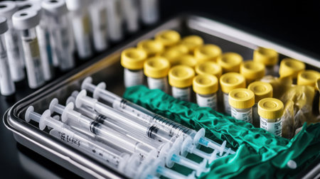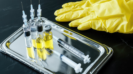 This image features medical equipment including syringes and vials placed on a metal tray, paired with yellow protective gloves, ideal for laboratory and healthcare uses.