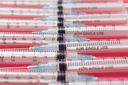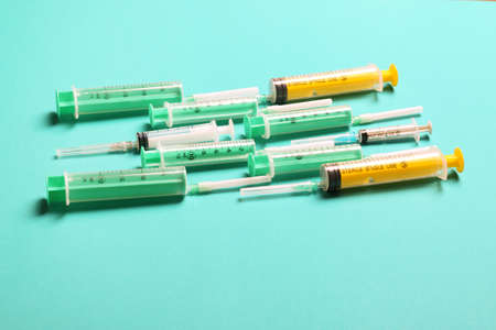 Many multicolor syringes, medical concept still life