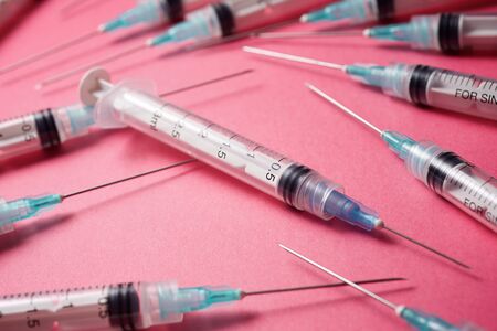Close-up of a group of syringes on a pink table.