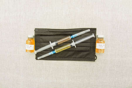 Medical vaccine against coronavirus close-up, covid 19, vaccination, injections, syringes, medical masks