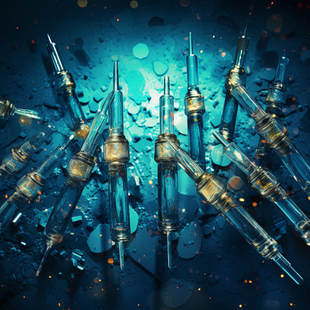 Syringes and ampoules on a polished metal background.