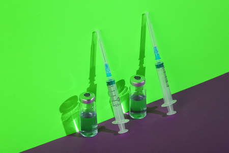 Syringes with vaccine bottles on a green-purple background. Creative medicine still life