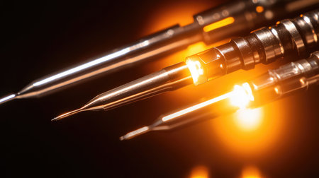 A detailed close-up image of precision tools with glowing tips, emphasizing their sharpness and sleek design against a dark backdrop, suitable for technology and engineering visuals.